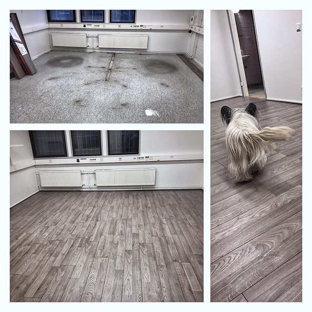 Toimistotilan muovimatto ennen laminaattilattian asennusta ja sen jälkeen – työ hyväksytty myös asiakkaan lattiasiantuntijan (oik.) puolesta!
